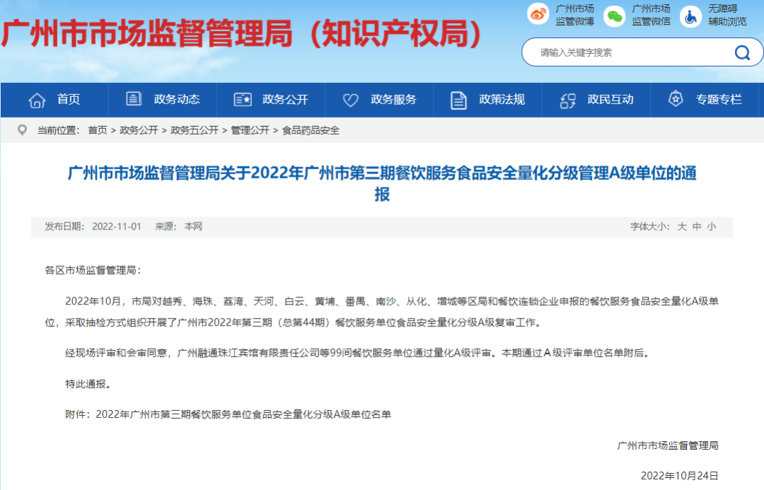 2022年10月,必赢官网(增城校区)第一食堂在集团和学校全面监督管理下,经过装修升级,进一步规范布局流程、强化监督检查、提升服务质量,通过了省、市、区市场监督管理部门多次严格检查,获得广州市局授予 “食品安全量化A级”称号。