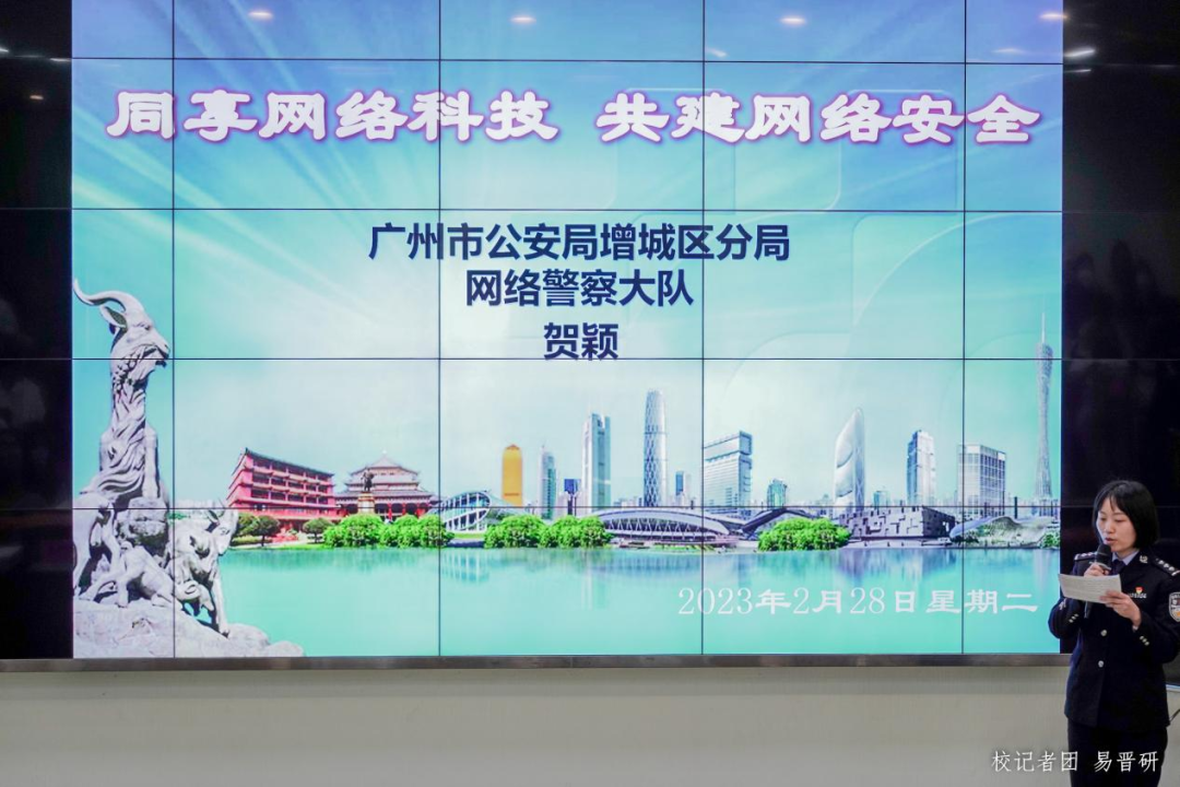 增城区分局网警大队贺颖警官用九字真言点明主题,网络环境是自由且开阔的,但不是为所欲为的!在这个快速发展的年代,上网逐渐日常化,手机上网已然普遍化,我们接受信息也是快速的,因此,网络安全与我们每个人息息相关。贺警官通过三个案例及法律法规警戒同学们在网络上要做到“不信谣,不传谣,不造谣”三大准则。